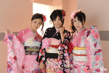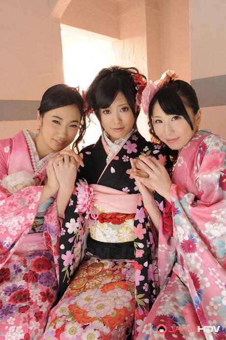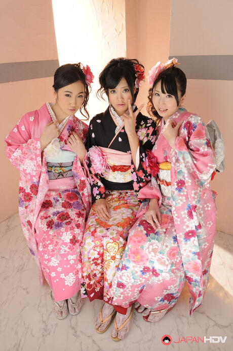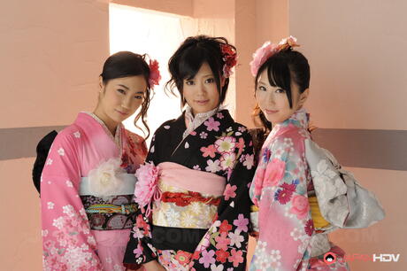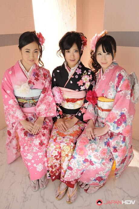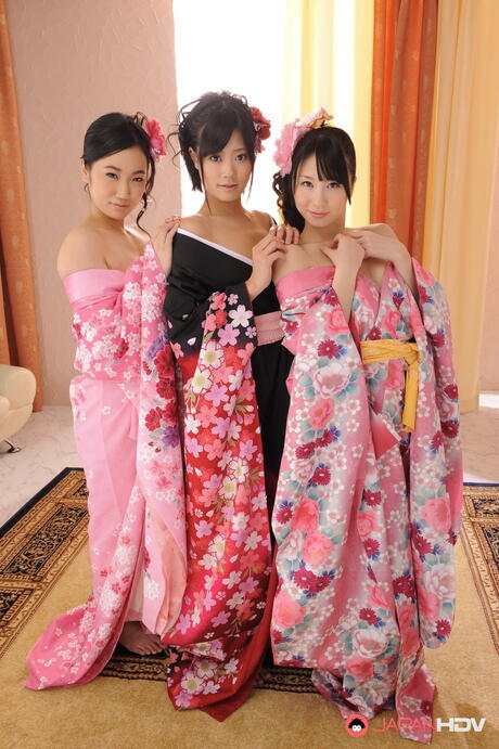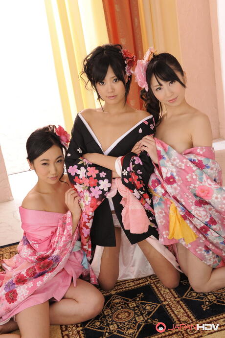 Japan HDV: Asian girls Sanae Momoi, Hina and Uta Kohaku pose naked in a kimono