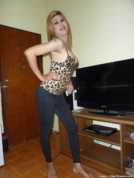 Ladyboy Gold: Blonde shemale Diamond strips her jeans and shows her big tits and dick