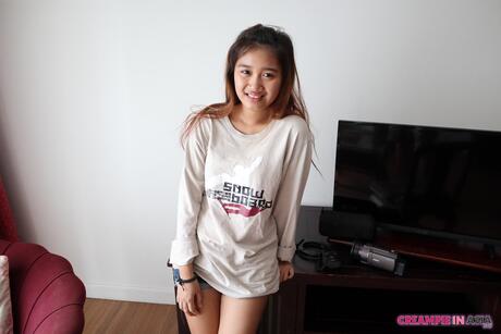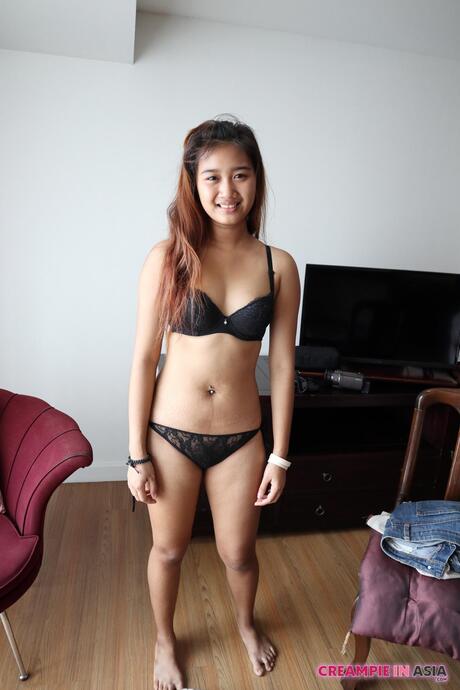 Creampie in Asia: Fantastic Asian babe Apple strips off her swimsuit and exhibits her pierced pussy