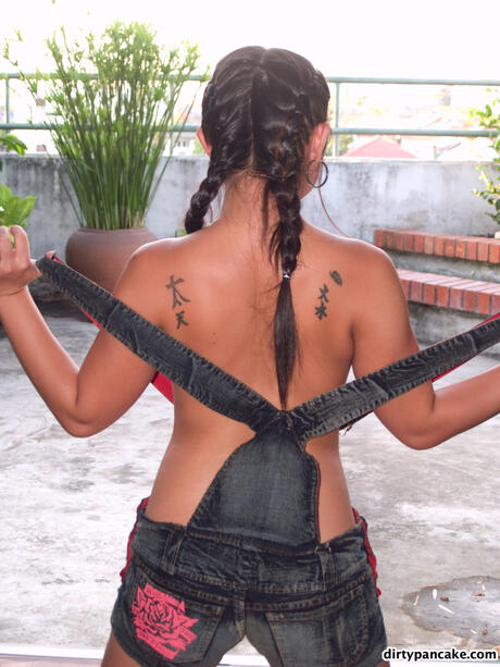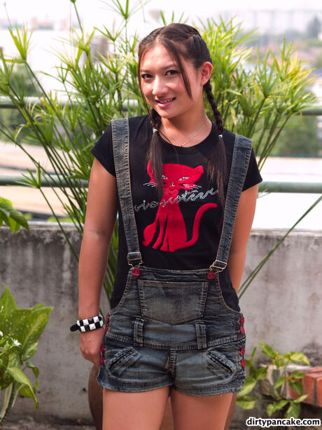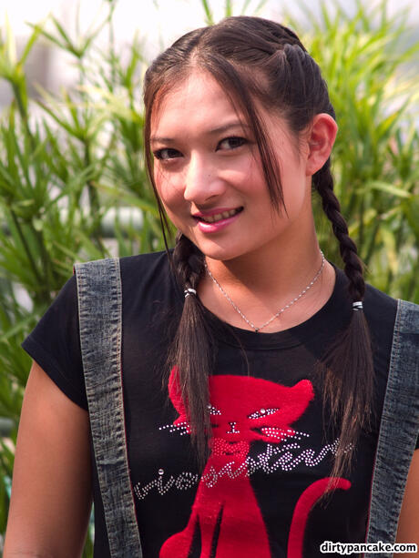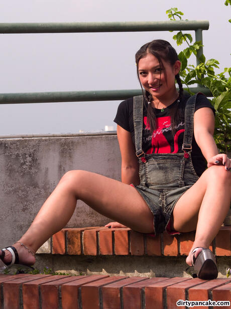 Dirty Pancake: Hot Asian teen Pancake strips and toys her pussy with a dildo on the stairs
