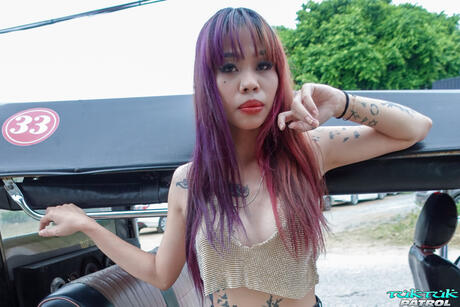 Tuk Tuk Patrol: Perfect Asian MJ shows her hot booty and pierced pussy in a solo outdoors