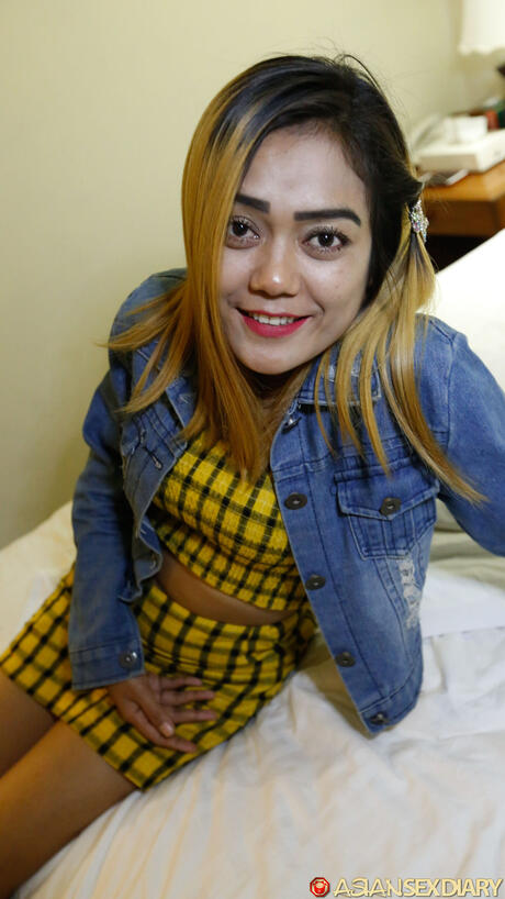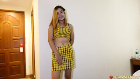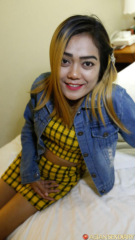 Asian Sex Diary: Perfect blonde Way C removes a plaid dress and pantyhose to pose nude in a bed