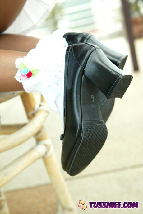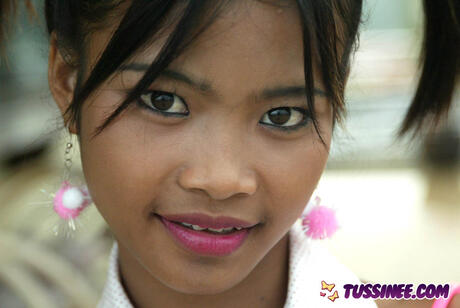 Tussinee: Perfect brunette Tussinee strips to her fishnets and shows her ass and pussy
