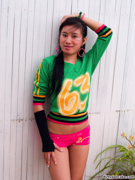 Dirty Pancake: Platinum Asian teen Pat strips off her pink leotard and panties to pose naked