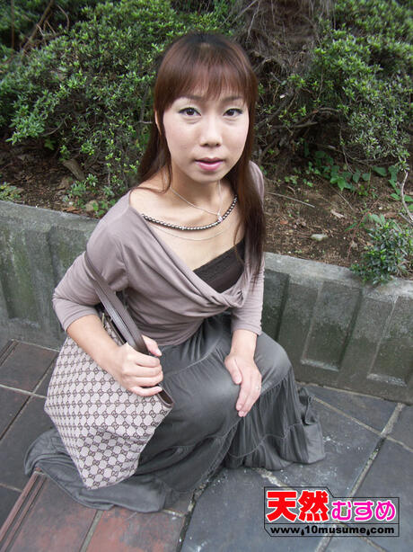 10musume: Sexy Asian AYU masturbates with a dildo after stripping in the garden