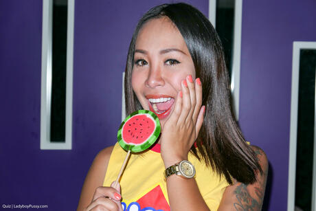 Ladyboy Pussy: Sexy Asian shemale Quiz toys her ass with a dildo and a butt plug