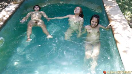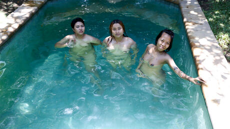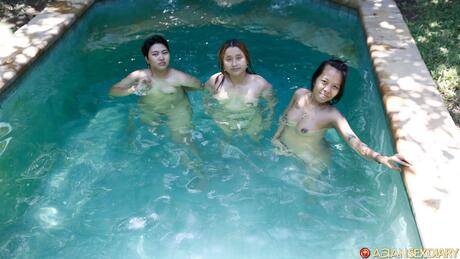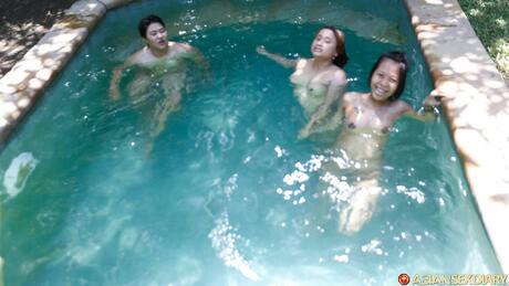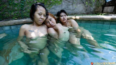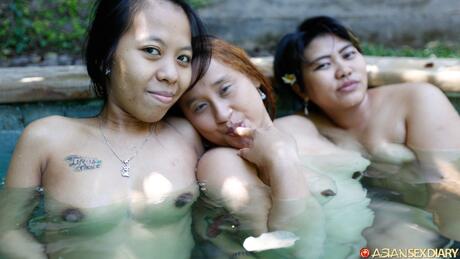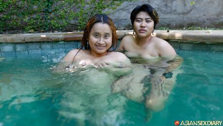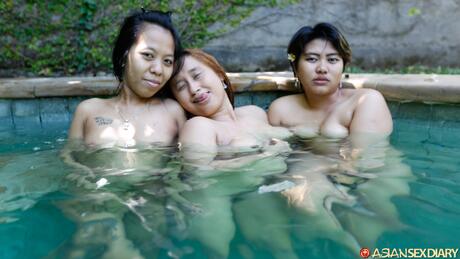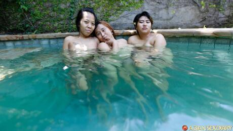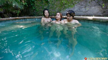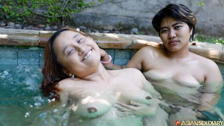 Asian Sex Diary: Sexy babes with big melons strip and masturbate in the waterfall