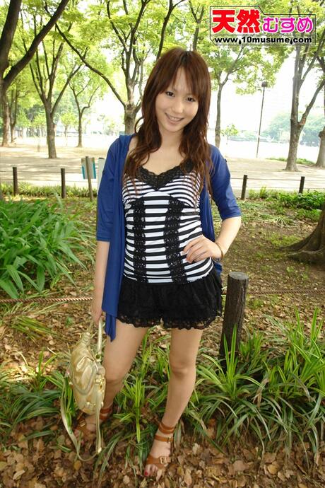 10musume: Sexy Japanese babe Mao strips and toys her pussy with a dildo in the garden