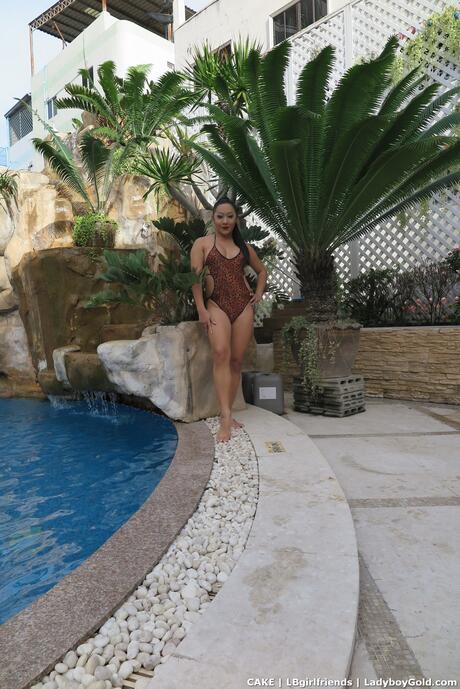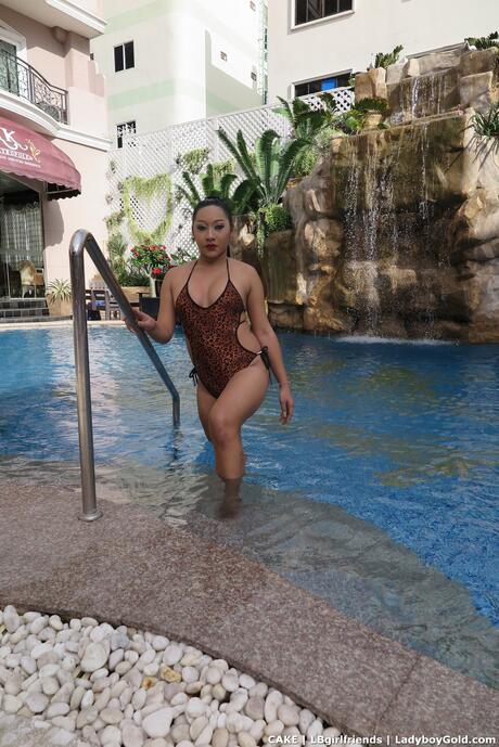 Ladyboy Gold: Sexy shemale Cake 2 strips her lingerie & gets her big booty fucked