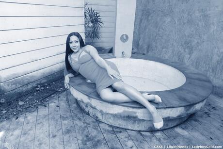 Ladyboy Gold: Sexy shemale Cake 2 strips her red dress and shows her big tits and dick
