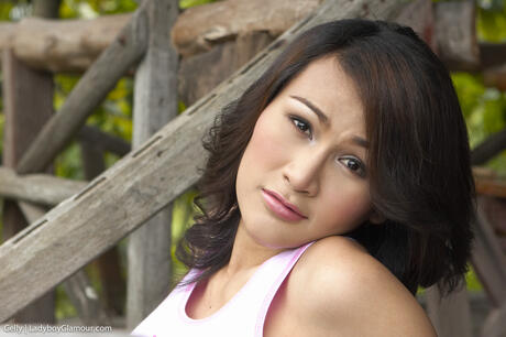 Ladyboy Gold: Sexy shemale Gelly strips her pink panties and shows her big dick