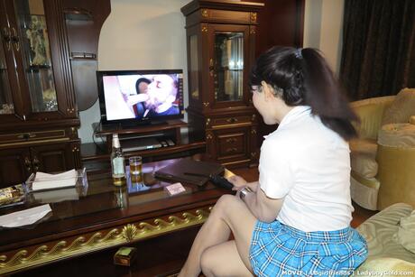 Ladyboy Gold: Sexy shemale Mos strips her schoolgirl outfit and masturbates in a solo