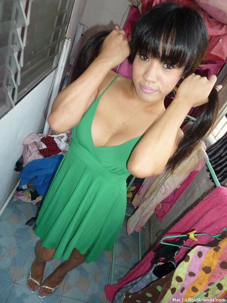 Ladyboy Gold: Sexy shemale Nin strips her green dress & shows her big tits & big dick