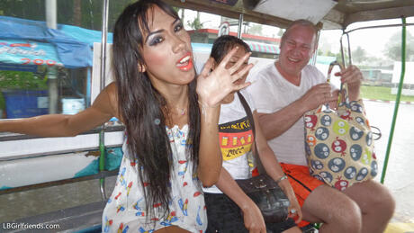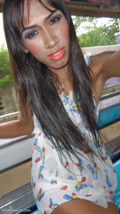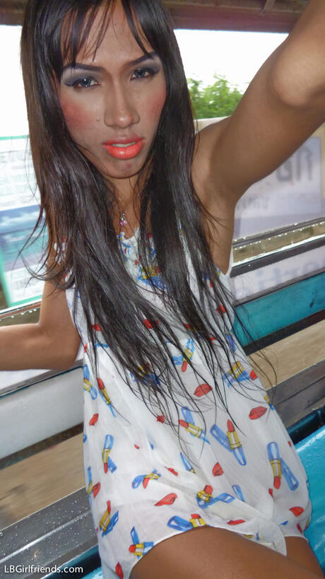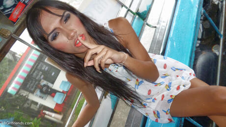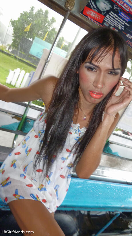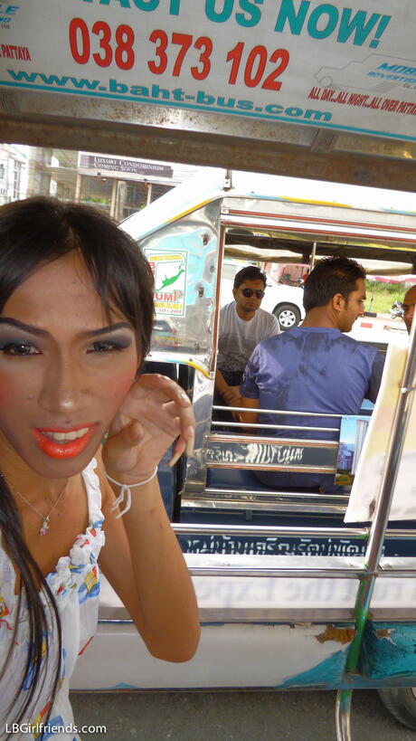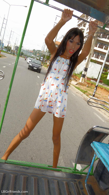 Ladyboy Gold: Sexy shemale One in a white dress shows her big dick and poses in a car