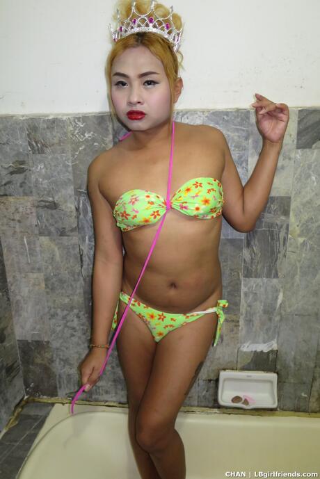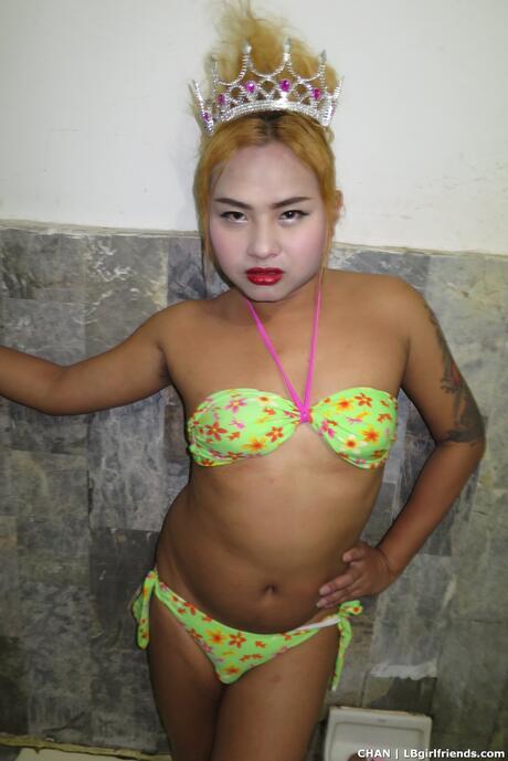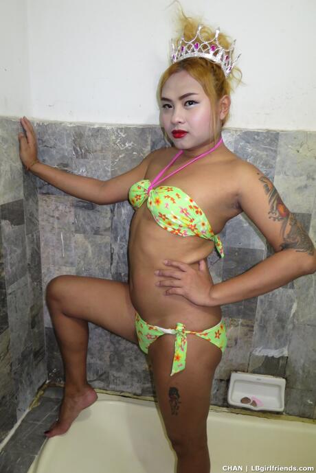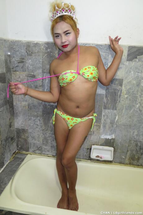 Ladyboy Gold: Sexy shemale Tata 2 strips her bikini and shows her big butt and dick