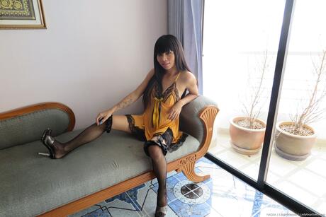 Ladyboy Gold: Shemale Nadia 6 in sexy black lingerie & high heels fucks her man