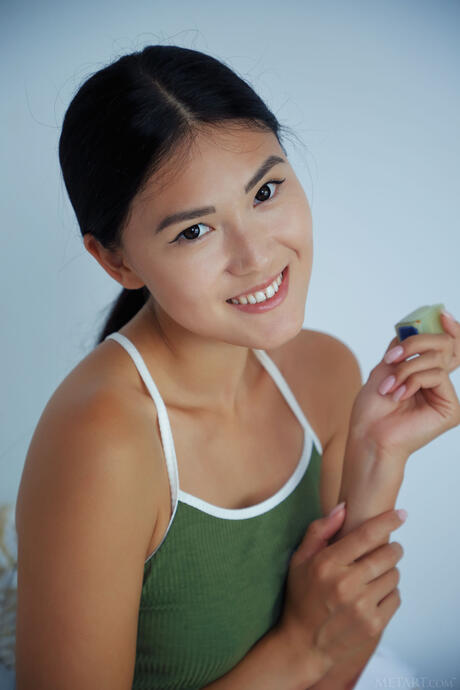 Metart: Skinny Asian teen Kimiko strips and masturbates on a bed in a solo