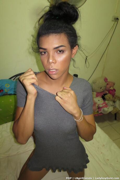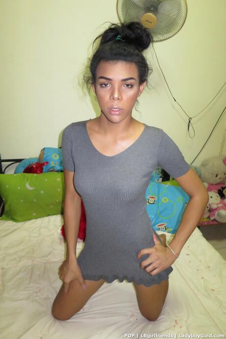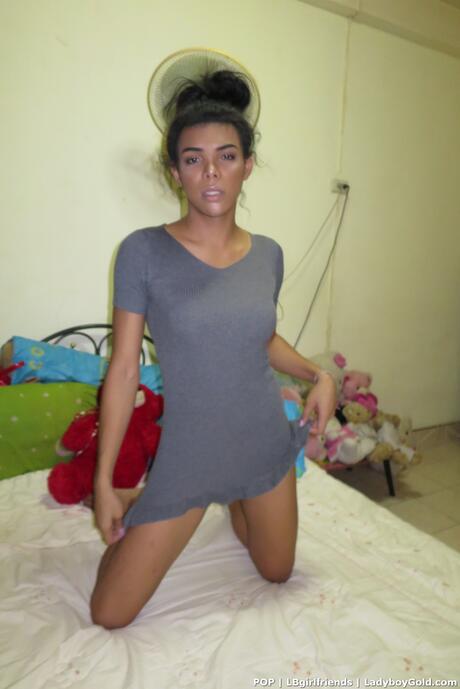Ladyboy Gold: Skinny shemale Poy 3 strips her sexy outfit and shows her big dick