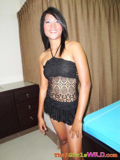 Thai Girls Wild: Superb Asian babe Koy strips off her black dress and toys her pussy in a solo