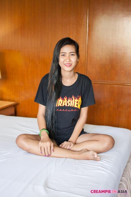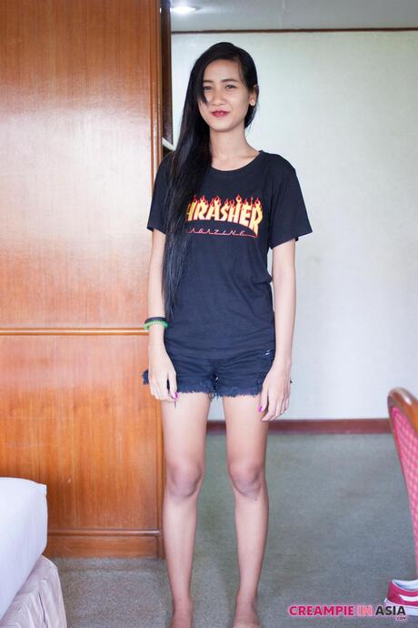 Creampie in Asia: Superb Asian babe Pop strips and shows her big butt and pierced pussy