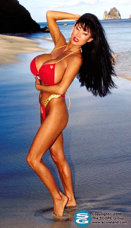 Score Land: Superb brunette Minka demonstrates her big boobs and ass poolside in a bikini