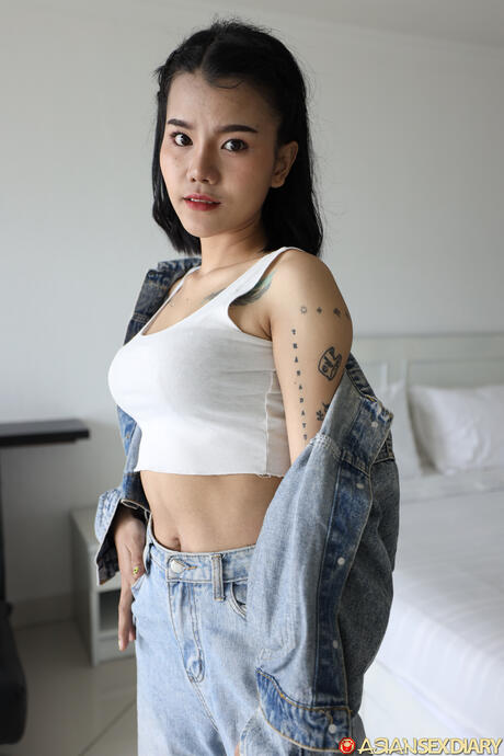 Asian Sex Diary: Tattooed Asian babe Pan reveals her big butt and toys her pussy in a solo