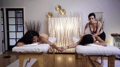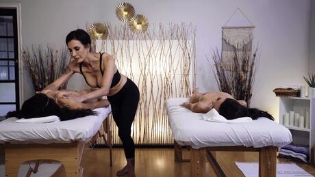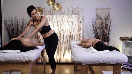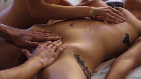 All Girl Massage: Tempting teens Vina Sky and Harley Haze share a big dick in a wild foursome