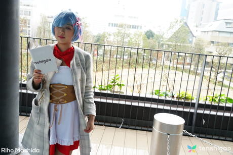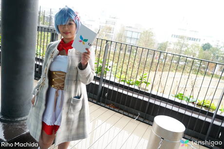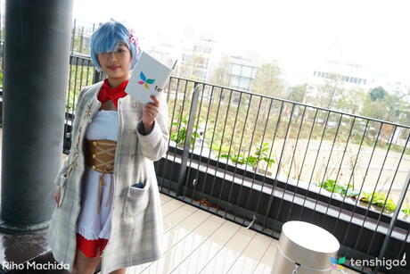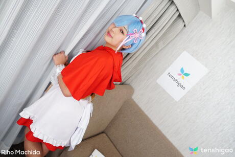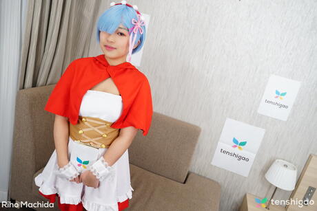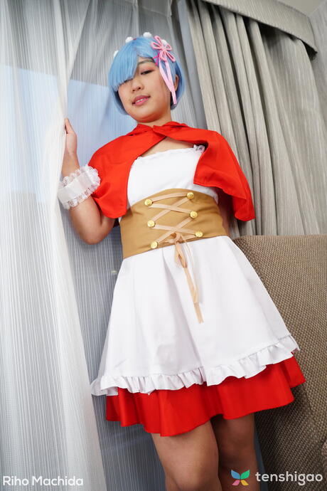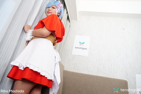 Tenshigao: The Asian maid Riho Machida is dressed in a red kimono and white gloves