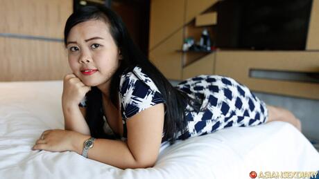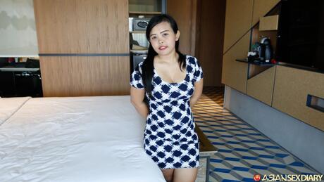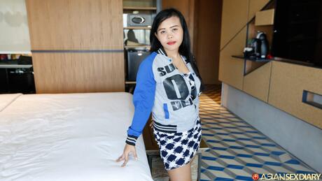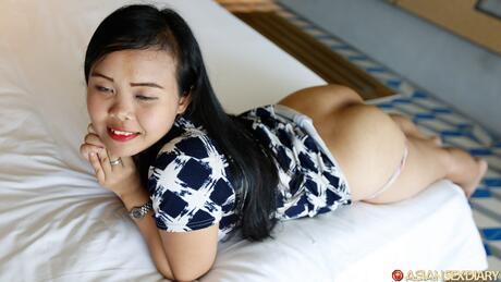 Asian Sex Diary: The sexy Asian babe Ice B gets her hairy cunt plugged by a hung guy