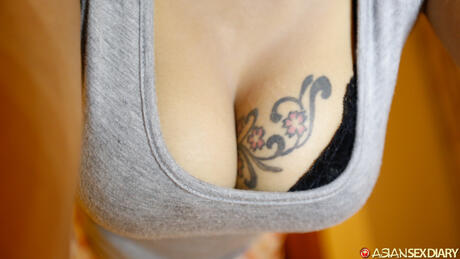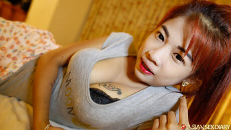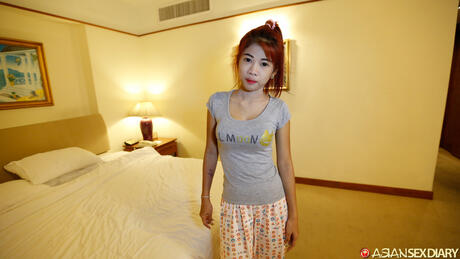 Asian Sex Diary: The young woman spreads her legs and fingers wet twat before stripping