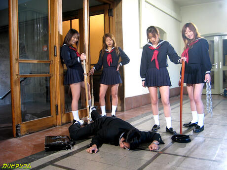 Caribbeancom: Three schoolgirls in sailor uniforms strip and play with a dildo in a bathroom